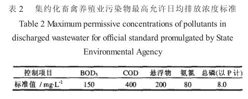 為控制畜禽養(yǎng)殖業(yè)產生的廢水、廢渣和惡臭對環(huán)境的污染, 國家環(huán)境保護總局發(fā)布了《 畜禽養(yǎng)殖業(yè)污染物排放標準》, 著手治理畜禽養(yǎng)殖場和養(yǎng)殖區(qū)的污染難題。這一標準旨在鼓勵生態(tài)養(yǎng)殖, 推動畜禽養(yǎng)殖業(yè)可持續(xù)健康發(fā)展; 促進畜禽場在廢棄物處理過程中考慮資源化利用, 減少末端污染物處理量。畜禽養(yǎng)殖業(yè)污染物排放標準見表 2 。