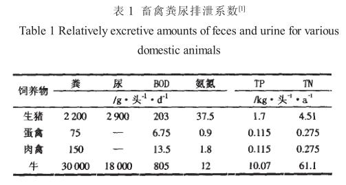 畜禽業(yè)是我國農業(yè)和農村經濟的重要組成部分,畜禽養(yǎng)殖業(yè)大力發(fā)展所帶來的環(huán)境污染問題日益嚴重, 不僅影響經濟發(fā)展, 而且還危及生態(tài)安全, 已成為人們普遍關注的社會問題。畜禽養(yǎng)殖場產生的糞便和污水造成地表水、地下水、土壤和環(huán)境空氣的嚴重污染, 直接影響了人們的身體健康和正常生產生活。畜禽養(yǎng)殖場未經處理的污水中含有大量污染物質, 其污染負荷很高, 各類畜禽糞尿排泄系數見表 1 。這種高濃度有機廢水直接排入或隨雨水沖刷進入江河湖庫 , 大量消耗水體中的溶解氧 , 使水體變黑發(fā)臭。水中含有大量的 N 、P 等營養(yǎng)物是造成水體富營養(yǎng)化的重要原因之一, 排入魚塘及河流使對有機物污染敏感的水生生物逐漸死亡, 嚴重者導致魚塘及河流喪失使用功能。養(yǎng)殖污水長時間滲入地下, 使地下水中的硝態(tài)氮或亞硝態(tài)氮濃度增高, 地下水溶解氧含量減少, 有毒成分增多, 導致水質惡化, 甚至喪失其使用功能, 同時危及周邊生活用水水質。高濃度污水還可導致土壤孔隙堵塞, 造成土壤透氣、 透水性下降及板結、鹽化, 嚴重降低土壤質量, 甚至傷害農作物 , 造成減產和死亡。