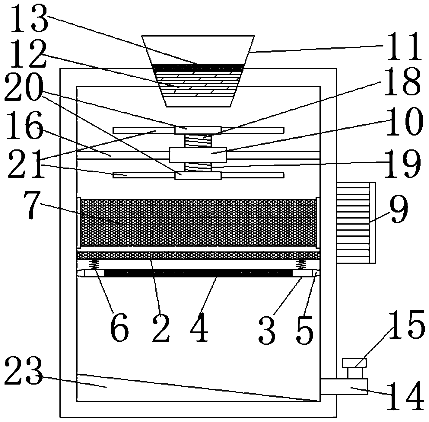 優(yōu)選的,所述廢水處理罐上端設(shè)置有進(jìn)水斗,所述進(jìn)水斗內(nèi)設(shè)置有呈“十”字形的永磁鐵架體,所述永磁鐵架體上放置有過濾網(wǎng);所述廢水處理罐下端設(shè)置有出水管,所述出水管上設(shè)置有閥門。